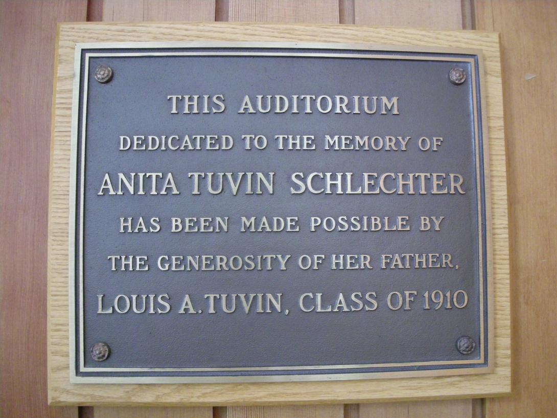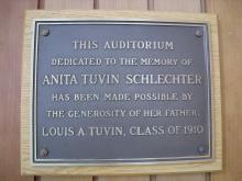 Dedicated to Anita Tuvin Schlechter, the auditorium was made possible through a gift by her father, Louis A. Tuvin Class of 1910. |