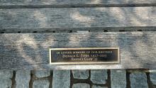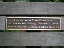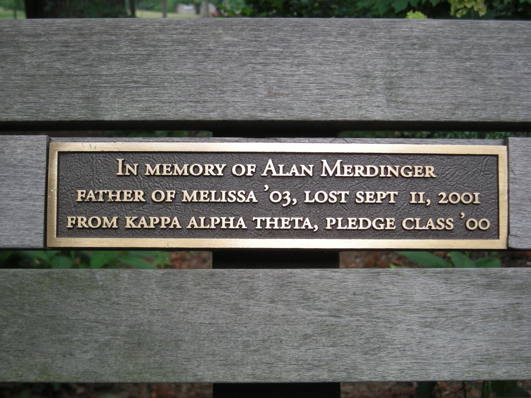 Located near the pergola in the rear of the Admissions Office, this bench plaque is in memory of Mr. Alan H. Merdinger P'03, father of Melissa '03, who died in the Sept. 11, 2001 attack on the World Trade Center in New York City. |
