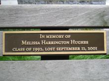 This bench, located outside of the Admissions Office, is in memory of Mrs. Melissa Harrington Hughes '92 who lost her life in the September 11, 2001 attack on the World Trade Centers in New York City. |