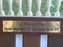 Bench plaque located in the Asbell Center Verandah recognizes Rachel Mendelson '03 and Aaron Pratt '03. |