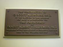 Plaque located in Althouse building recognizes C. Scott Althouse's gift in honor of his friend, Ernest Albert Vuilleumier |