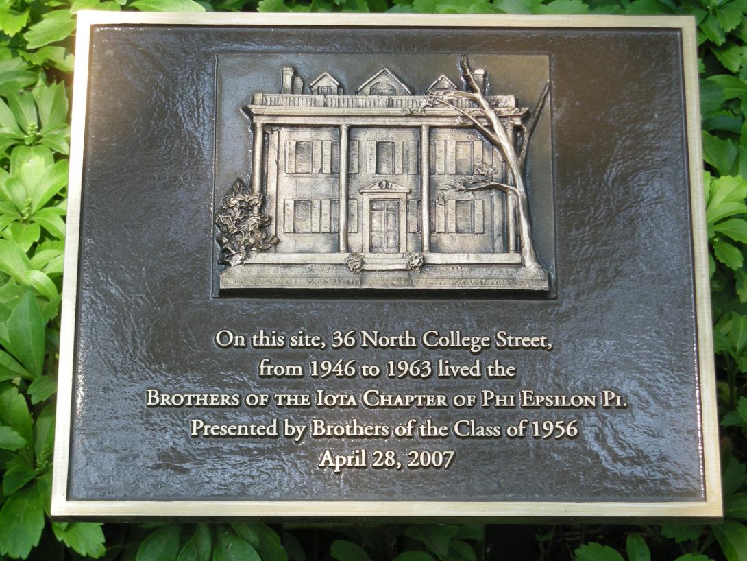 Fraternity house formerly at 36 North College Street. Plaque is located at site of former fraternity house, in front of the Holland Union Building (HUB). |