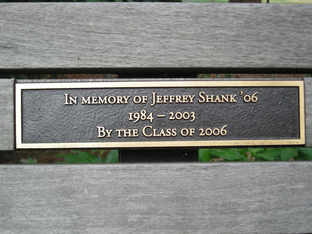 Located in the rear of the Admissions Office, this bench plaque was donated in memory of Jeffrey Shank '06 by the Class of 2006. Update: Relocated to East College gardens during renovation of Waidner Admissions House. |