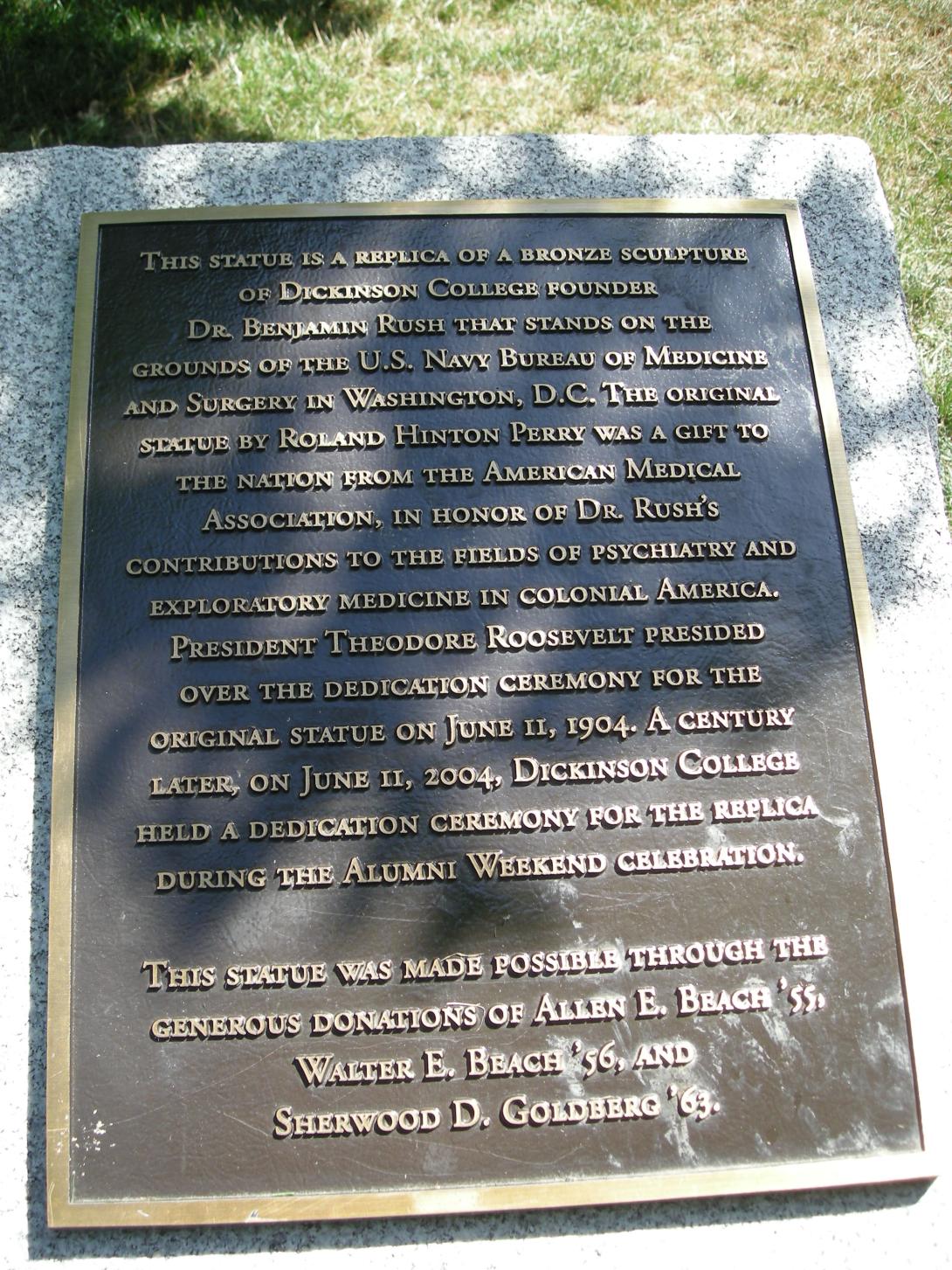 Benjamin Rush Statue. Made possible by Allen E. Beach '55, Walter E. Beach '56, and Sherwood "Woody" Goldberg '63. |
