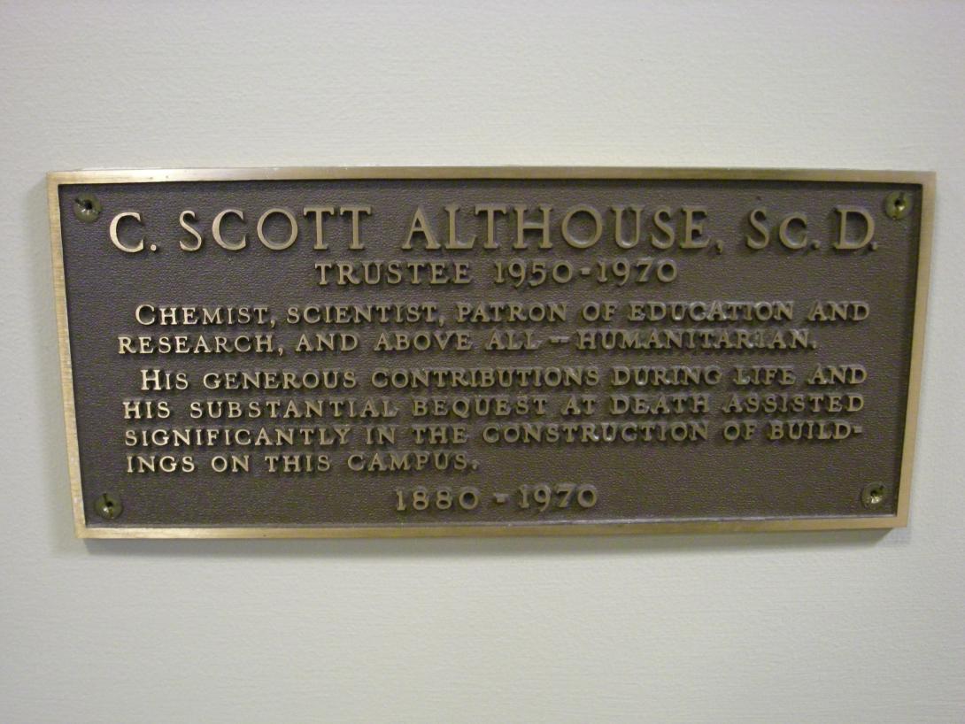 Plaque honoring C. Scott Althouse for his contributions to the college and recognizing the support he provided for the development of the Althouse Building. |