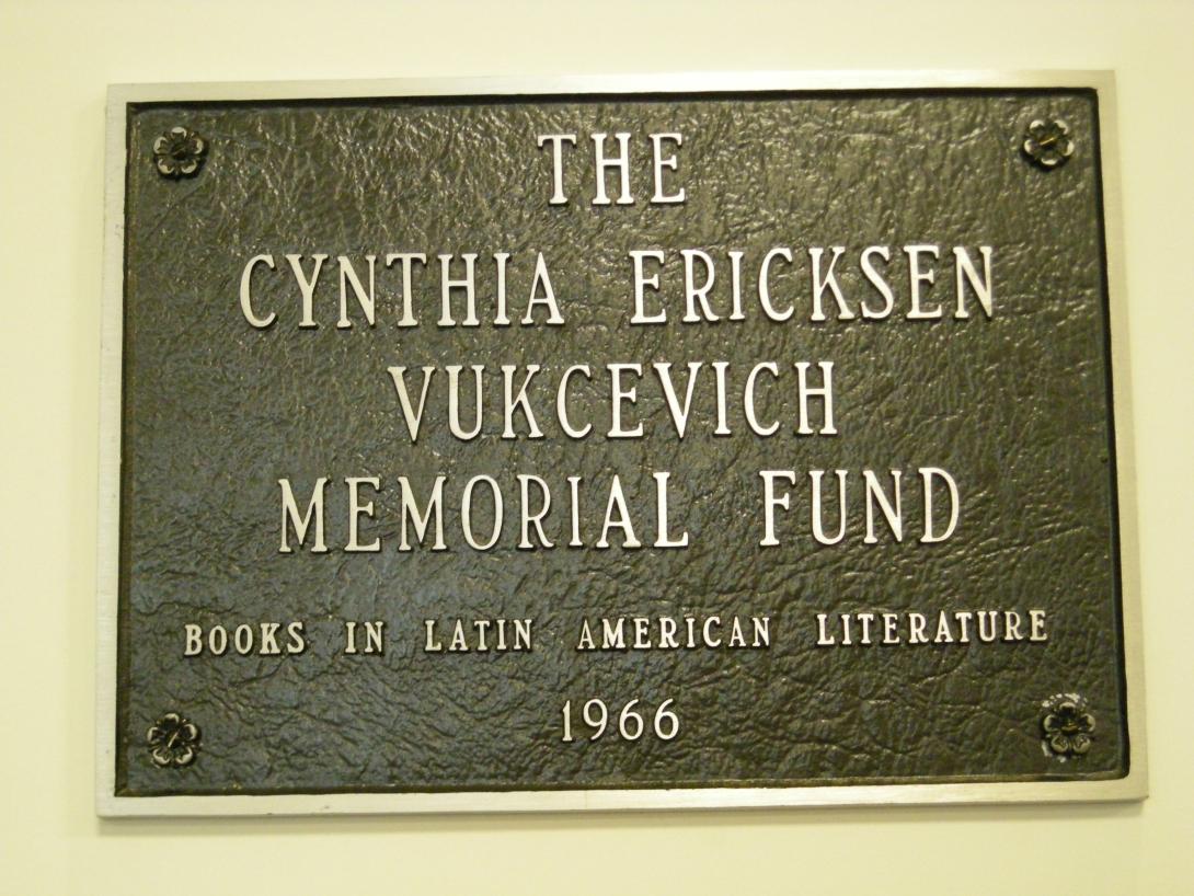 Plaque, located in the main level of the library, recognizes The Cynthia Ericksen Vukcevich Memorial Fund for books in Latin American literature (1966). |