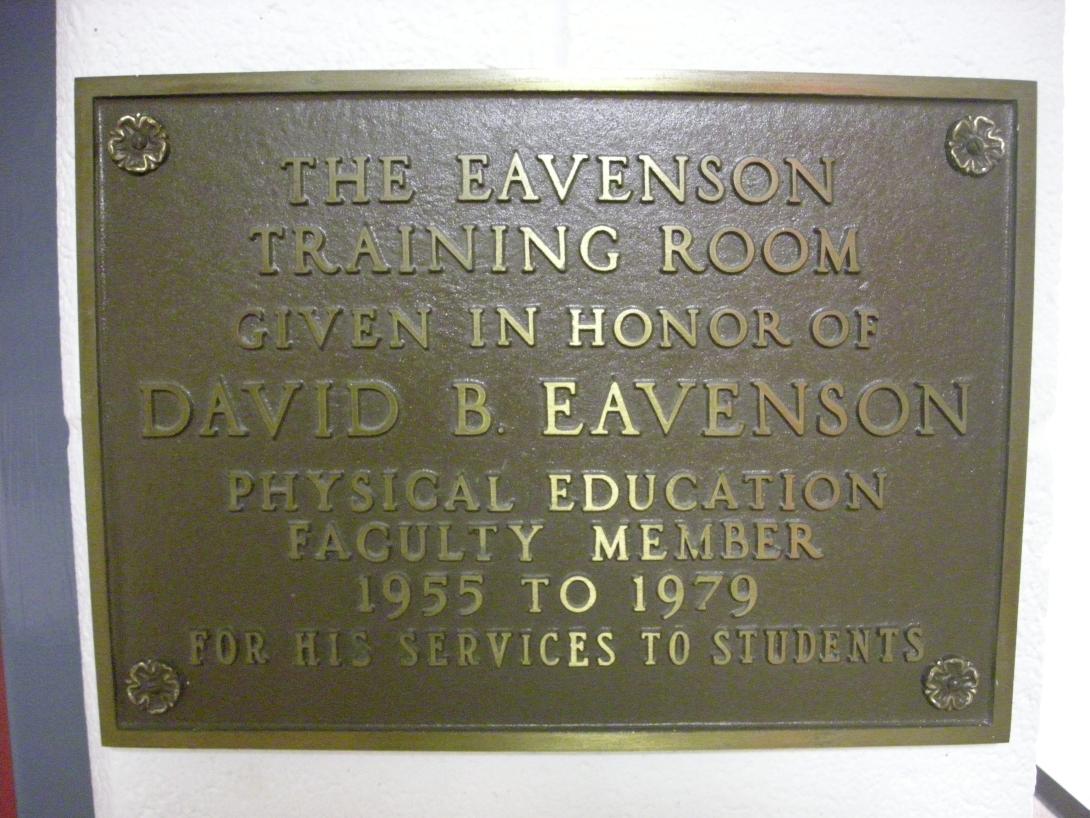 Located in the Kline Center, this plaque dedicates the Eavenson Training Room in honor of David B. Eavenson, Physical Education faculty 1955-1979, for his service to students. |
