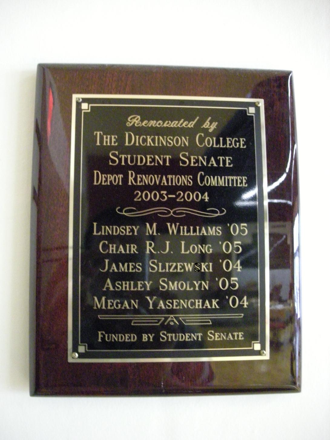 Located in The Depot, this plaque recognizes the members of the 2003-2004 Depot Renovations Committee. |