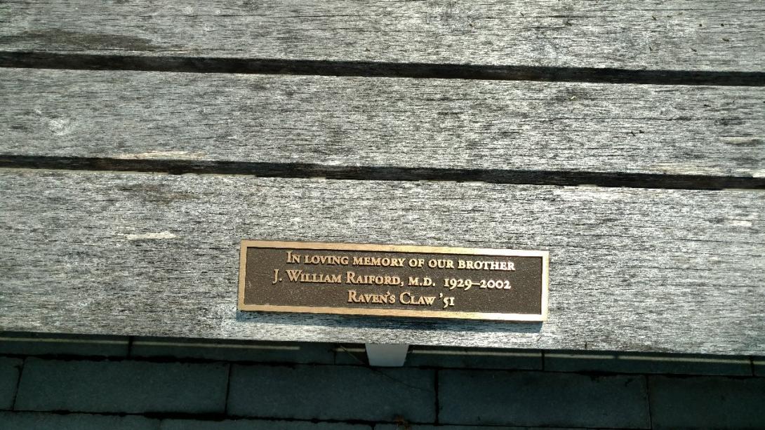 This bench, located in front of the Kline Center, is dedicated in loving memory to J. William Raiford, Class of 1951 and former Raven's Claw member, by his fellow Raven Claw brothers. |