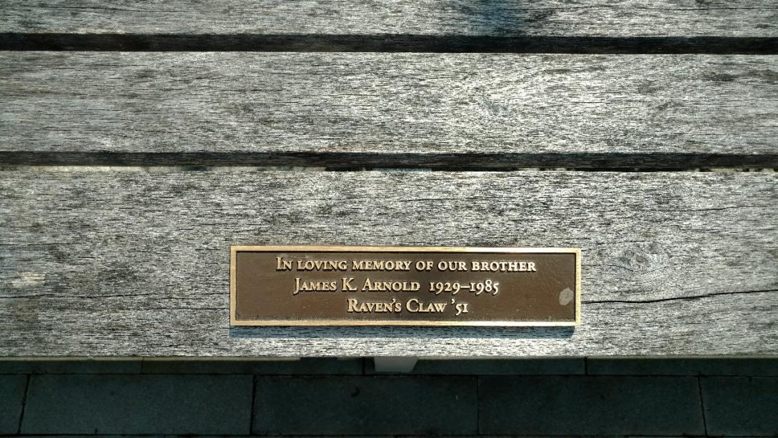 Located in front of the Kline Center, this bench plaque is in memory of James K. Arnold, former Raven's Claw member from the class of 1951. This is one of 7 benches remembering the 1951 Raven's Claw. |
