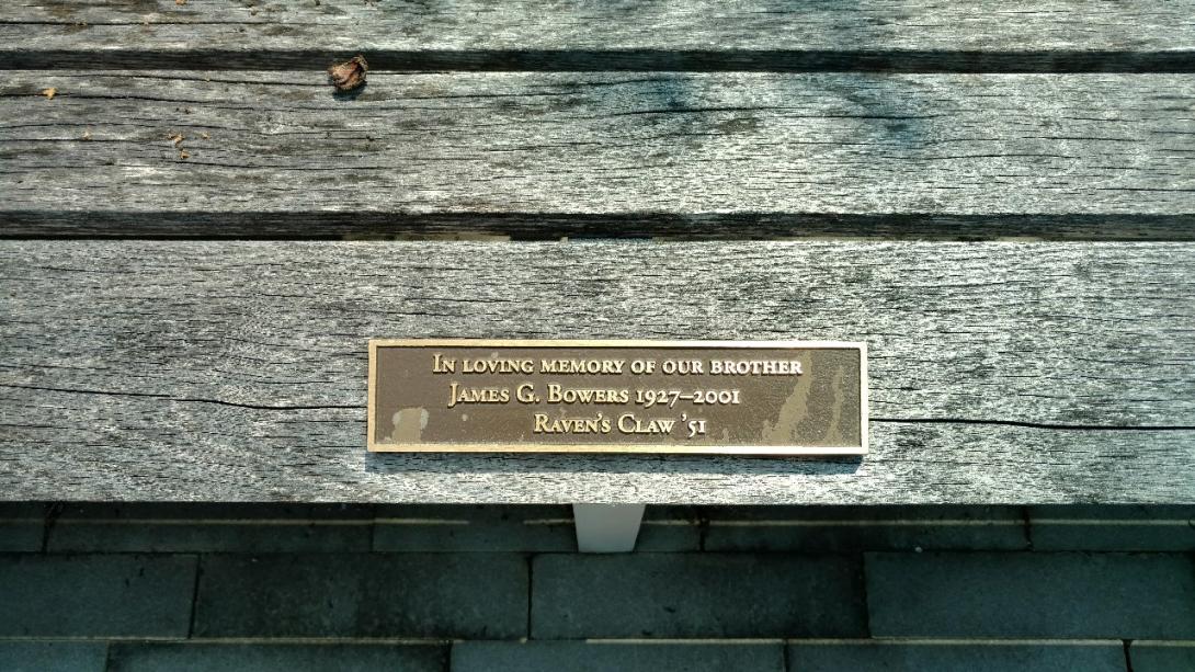 Located in front of the Kline Center, this bench plaque is in memory of James G. Bower '51, former member of Raven's Claw. This is one of 7 benches remembering the members of the 1951 Claw. |