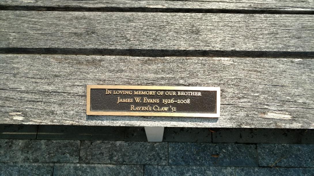 Located in front of the Kline Center, this bench plaque is in memory of James W. Evans, Esq. '51, a former Raven's Claw member. This is one of 7 benches remember the Claw of 1951. |