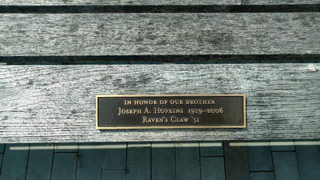 Located in front of the Kline Center, this bench plaque is in honor of Joseph A. Hopkins '51, a former member of Raven's Claw. This is one of 7 benches remembering the 1951 Claw. |