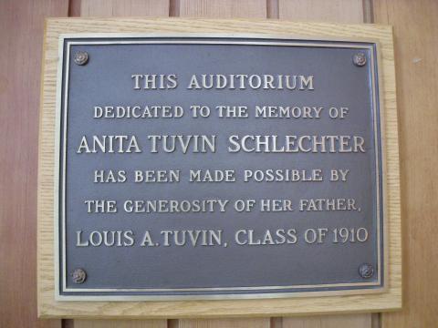 By admin , 27 July, 2017 Dedicated to Anita Tuvin Schlechter, the auditorium was made possible through a gift by her father, Louis A. Tuvin Class of 1910. In memory of Anita Tuvin Schlechter Status Active Location Anita Tuvin Schlechter Auditorium, Ground Floor