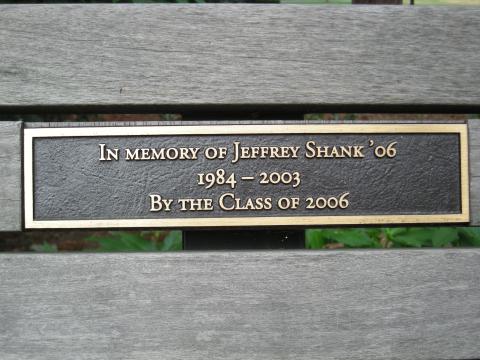 Located in the rear of the Admissions Office, this bench plaque was donated in memory of Jeffrey Shank '06 by the Class of 2006.