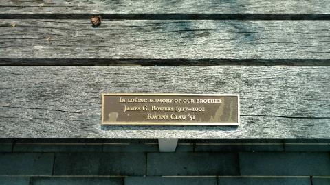 Located in front of the Kline Center, this bench plaque is in memory of James G. Bower '51, former member of Raven's Claw. This is one of 7 benches remembering the members of the 1951 Claw.