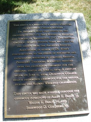 By admin , 27 July, 2017 Benjamin Rush Statue. Made possible by Allen E. Beach '55, Walter E. Beach '56, and Sherwood "Woody" Goldberg '63. Status Active Location Between Old West and East College in front of Hurwitz Green