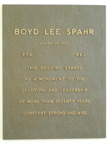 By admin , 27 July, 2017 Located in the main level of the library, this plaque recognizes 70 years of service by Boyd Lee Spahr. In memory of Boyd Lee Spahr Status Active Location Library, Main Level