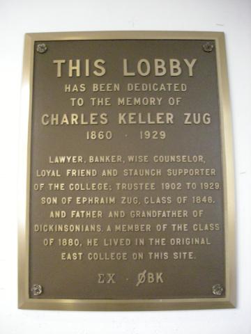 Lawyer, Banker, Wise Counselor, Loyal Friend and Staunch Supporter of the College, Trustee 1902-1929, Son of Ephraim Zug, class of 1846, and Father and Grandfather of Dickinsonians. A member of the class of 1880, he lived in the original East College on this site.