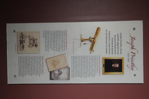 By admin , 27 July, 2017 A panel that tells the story of Joseph Priestley, scientist who discovered oxygen. His scientific apparatus are housed in the college's Archives. Status Active Location connector between Stuart & James halls, first floor