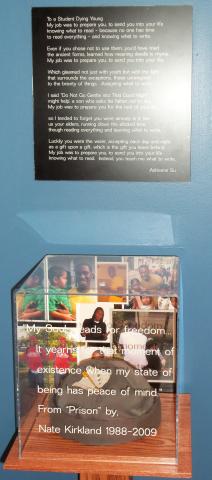 This memorial is located in the campus media center (basement of Bosler) where Nate worked and spent much of his time and energy as a student on campus. The plaque features a poem written by Adrienne Su entitled "To a Student Dying Young". The tribute also includes a collage of photos in a glass case along with Nate's Gray hat and an excerpt from his poem "Prison". Nate died tragically in a drowning accident while on the winter-break service trip to Guatemala in 2009.