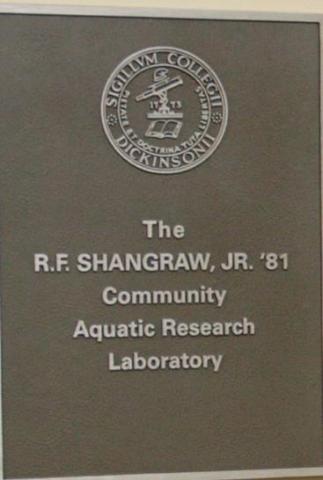 The R.F. Shangraw, Jr. '81 Community Aquatic Research Laboratory is used as part of the Allarm Program. This bronze plaque is located in Kaufman Building (Room 124C). The lab was dedicated on June 9, 2001.
