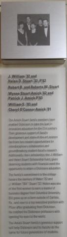 Founders Society Plaque for the Stuart and Amick families. The family has a commitment to faculty development and state-of-the art science facilities as well as interdisciplinary collaboration and groundbreaking student-faculty research. Their scholarship is the J. William and Helen Stuart Scholarship Fund, which gives deserving students with financial need the opportunity to attend Dickinson. The plaque honors: J. William '32 and Helen D. Stuart '32, P'62, Robert B. and Roberta W. Stuart, Wynne Stuart Amick '62 and Patrick J. Amick P'93, William S. '93 and Cheryl O'Connor Amick '91. Dedicated in Inaugural Founders Society Ceremony on Friday, May 6, 2011.