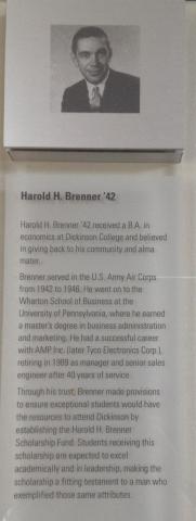 Founders Society Plaque in memory of Harold H. Brenner '42. Mr. Brenner established the Harold H. Brenner Scholarship Fund through his trust. Students receiving this scholarship are expected to excel academically and in leadership. The Inaugural Founders Society Dedication Ceremony was held on Friday, May 6, 2011.