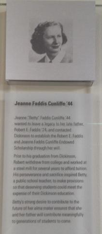 Founders Society Plaque for Jeanne Faddis Cunliffe '44. She wanted to leave a legacy to her late father (Robert E. Faddis '24) and established the Robert E. Faddis and Jeanne Faddis Cunliffe Endowed Schoarship through her will. The scholarship was created to make provisions so that deserving students could meet the expense of a Dickinson education. The Inaugural Founders Society Dedication Ceremony was held on Friday, May 6, 2011.
