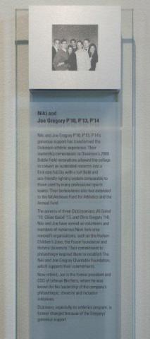 Founders Society Plaque for Niki and Joe Gregory P'10, P'13, P'14. Their generous support of the Biddle Field renovations in 2009 assisted with a first-rate facility which includes a turf field and eco-friendly lighting system. They have also generously supported the McAndrews Fund for Athletics as well as the college Annual Fund. Also noted on this plaque are their three children: Alex Golod '10, Chloe Golod '13 and Chris Gregory '14. The Inaugural Founders Society Dedication Ceremony was held on Friday, May 6, 2011.