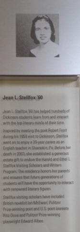 Jean L. Stellfox '60 Individual Founders Society Plaque. Inspired by meeting the poet Robert Frost during his 1959 visit to Dickinson, Ms. Stellfox established a generous estate gift to endow the Harold and Ethel L. Stellfox Visiting Scholars and Writers Program. The residency honors her parents and ensures that future generations of students will have the opportunity to interact with remounded literary figures. Dedicated in Inaugural Founders Society Ceremony on Friday, May 6, 2011.