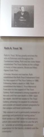 Ruth A. Trout '36 Individual Founders Society Plaque. A former librarian and teacher, Ms. Trout and her sister Helen established The Trout Gallery in honor of their parents Brook and Mary Agnes Cook Trout. She also established the Ruth Trout Endowment Fund for the support of the Trout Gallery in 1986. In addition, Ruth established the Helen E. Trout Memorial Fund also in support of the Trout Gallery after the death of her sister in 1990. Dedicated in Inaugural Founders Society Ceremony on Friday, May 6, 2011.