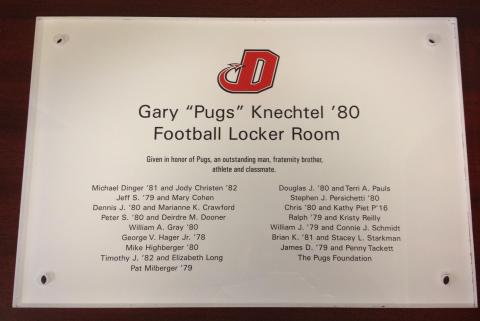By admin , 27 July, 2017 Given in honor of Pugs, an outstanding man, fraternity brother, athlete and classmate. See plaque photo for donor names. 18"x12" Lucite In memory of Gary "Pugs" Knechtel '80 Status Active Tree Species N/A Location Durden Athletic Training Center (DATC), outside Football Locker Room
