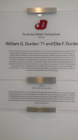 The Durden Athletic Training Center is named for William G. Durden ’71, Dickinson’s 27th president, and his wife, Elke F. Durden, professor of German, in recognition of their many valuable contributions to the college during the 14 years they served this institution. William “Bill” Durden received his undergraduate degree from Dickinson in German and philosophy in 1971, and enjoyed a distinguished career as an educator, administrator and senior education consultant to the U.S. Department of State and various U.S. ambassadors. He and Elke returned to his alma mater in 1999, and he served as president until July 1, 2013. During his tenure, Bill led a transformation of the college that included the creation of 18 new academic posts, the construction and renovation of numerous campus buildings, the establishment of the college’s first Office of Diversity Initiatives, College Farm and Center for Sustainability Education, and the shaping of the Dickinson as a nationally recognized leader in liberal-arts education. The Durden Athletic Training Center celebrates Bill’s outstanding leadership as president of Dickinson College and the enduring friendship of Bill, Elke, Sam and Julie.