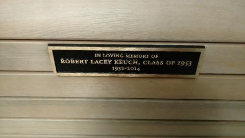 By renaultt , 14 August, 2018 In loving memory of Robert Lacey Keuch, class of 1953 1932-2014 A gift of EK Weitzel 10"x 2.5" Bronze In memory of Robert Lacey Keuch, Class of 1953 Status Active Tree Species NA Location Southwest Corner of Bosler Hall facing Waidner Admissions House