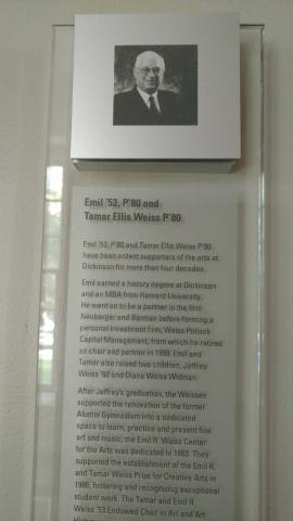 After Jeffrey’s graduation, the Weisses supported the renovation of the former Alumni Gymnasium into a dedicated space to learn, practice and present fine art and music; the Emil R. Weiss Center for the Arts was dedicated in 1983. They supported the establishment of the Emil R. and Tamar Weiss Prize for Creative Arts in 1986, fostering and recognizing exceptional student work. The Tamar and Emil R. Weiss ’53 Endowed Chair in Art and Art History was created in 2002, with Assistant Professor of Art Ren Wei appointed to the post in 2015.