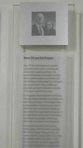 The Pappases were installed into the Founders' Society at a ceremony in 2012. Dean Pappas was a 1962 graduate of Dickinson and Zoë is a graduate of Wellesley. Upon graduation from Dickinson, Dean joined his father at the family business, Clement Pappas, a food processing and juice bottling firm, where he remained until he retired in 2011, while Zoë has enjoyed serving as docent at the Philadelphia Museum of Art for many years. Dean and Zoë are both very committed to education, the arts, and public service. They are long-term supporters of Dickinson and have helped the college advance institutional diversity priorities – most notable is their long-standing dedication to our Posse program. Their most recent gift to Dickinson, The Dean '62 and Zoe Pappas Scholarship, acknowledges their commitment to provide access to a liberal arts education by endowing a scholarship that will provide significant support each year, in perpetuity.