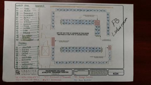 Layout of donated lockers in the football locker room.Locker number, honoree last name, and text on tag are provided below.