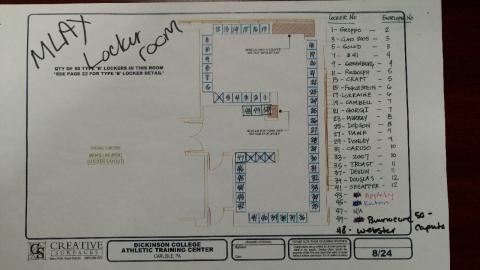 Diagram of locker room tags for the men's lacrosse locker room in the Durden Athletic Training Center (DATC). Information includes honoree last name, locker number, locker tag text.