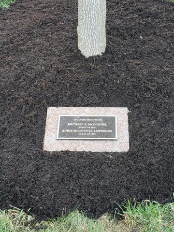 This is a replacement for a memorial plaque in memory of Michael that was originally placed at the entrance of the Kline Center. After renovations, that plaque was not recovered. The college agreed to re-cast the plaque and include Aurie, who has since passed, in the memorial tribute. The new plaque is located in the inner courtyard of the Kline Center near the basketball half-court.